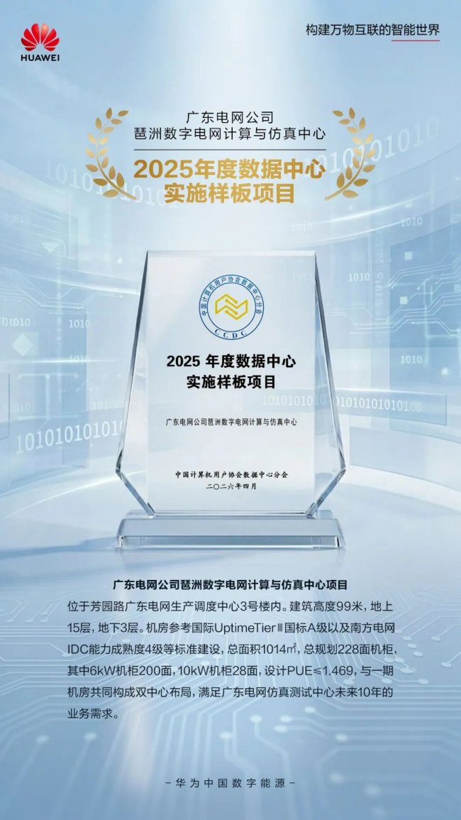 大会同期,由华为深度参与的广东电网公司琶洲数字电网计算与仿真中心项目,荣获中国计算机用户协会数据中心分会颁发的“2025年度数据中心设计样板项目”与“2025年度数据中心实施样板项目”两项殊荣。该项目参照Uptime Tier Ⅲ、国标A级及南方电网IDC能力成熟度4级标准建设,总规划228面机柜,设计PUE≤1.469,与一期机房形成双中心布局,成为电力行业数字化转型的标杆案例。